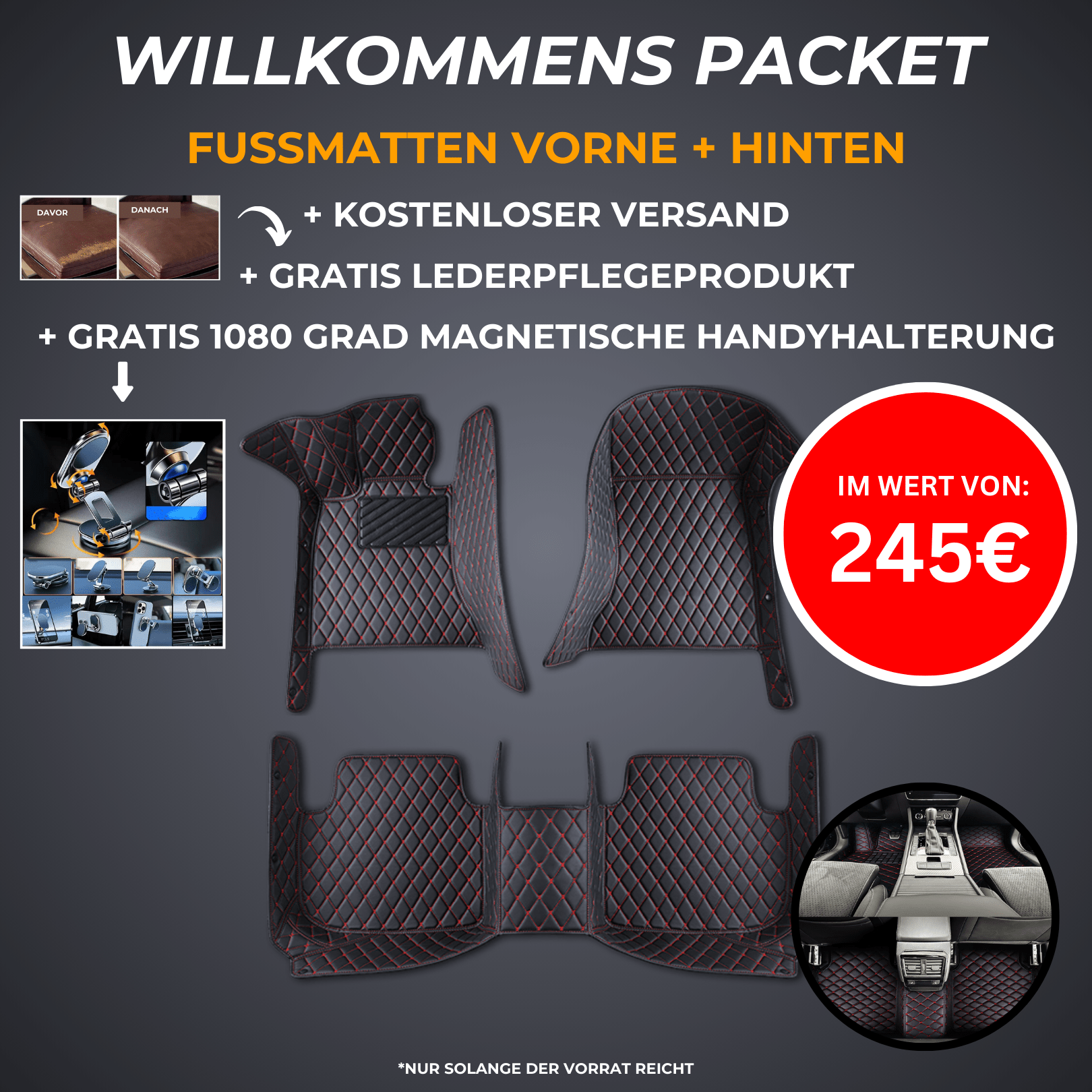 | Anzahl der Matten | Fahrzeugmatten nur Vorne, Fahrzeugmatten nur Hinten, Fahrzeugmatten Vorne + Hinten |
